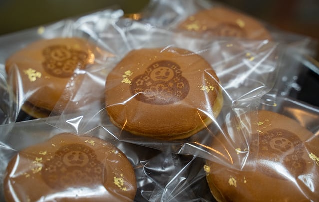 加賀野菜の五郎島金時100%使用のさつまいもあんを石川県マスコットキャラクター "ひゃくまんさん" の焼き印と "金箔" をあしらった皮で包みました。